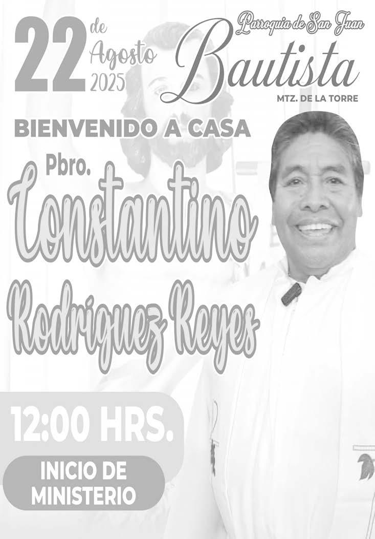 zará el próximo viernes 22 de agosto a las 12:00 del día en la parroquia San Juan Bautista, por lo que se invita a la población para que asista y le dé la más cordial bienvenida al párroco Constantino Rodríguez Reyes, quién proviene del municipio de Papantla, previo a ello estaba en la parroquia Nuestra Señora de Guadalupe en Villa Independencia en este municipio, por lo que familias le tienen un gran cariño y aprecio. Por último, es preciso recordar que la misa de despedida del párroco Óscar Monroy se llevará a cabo el próximo miércoles 20 de agosto a las 6:00 de la tarde y la misa de bienvenida del padre Constantino Rodríguez Reyes se efectuará el viernes 22 a las 12:00 del día.