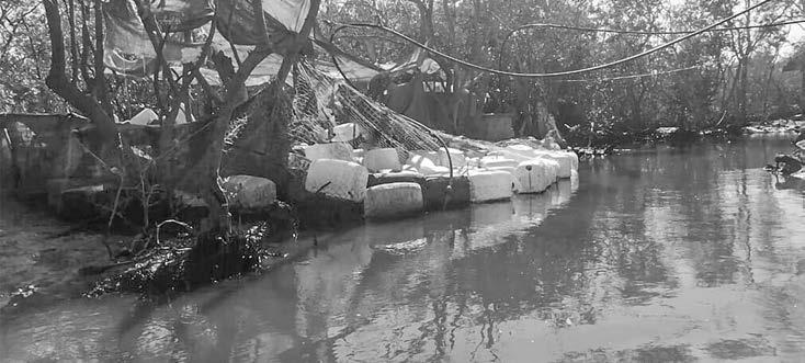 En el camino nos cuenta que en esa región pescan pargo, curvina, mero, lisa, y algo de robalo; también extraen ostiones y patas de mula, y donde instalaron el narcolaboratorio es una zona de alta producción para estas especies. Al tomar uno de los canales más estrechos, se comenzó a percibir un fuerte olor a químicos proveniente de los mangles. Hace casi dos años que fue desmantelado, el aroma sigue siendo, algo entre podrido y artificial, a lo que la naturaleza regularmente no huele; el olor era fuerte hasta para nuestro guía. Para los pescadores de la zona, el mangle es un refugio natural de los peces, es el lugar donde se protegen de los depredadores, hasta alcanzar un tamaño donde ya no son tan vulnerables, en sus raíces también se crían crustáceos, por eso es tan importante para ellos. Pero ahora sirven como otro tipo de refugio. Se han convertido en el nuevo espacio predilecto de los cárteles para instalar los laboratorios de droga sintética por el difícil acceso a los mismos;