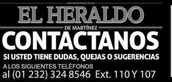 EL HERALDO DE MARTINEZ es una publicación diaria de lunes a sábado. Viernes 18 de Octubre de 2024 | Año 6 | No. 2037 | Editor responsable Ing. Eduardo Sánchez Macías. Número de certificado de Reserva de Derecho al Uso Exclusivo del Titulo 04-2017-090412182000-101. Certificado de Licitud 17081. Certificado de Licitud de Contenido 17081. Domicilio de la publicación, impreso y distribuido por Empresas Franes, S.A. de C.V., con domicilio en Boulevard Rafael Martínez de la Torre No. 168. Esq. 22 de Noviembre, Col. San Manuel, Martínez de la Torre, Ver., C.P. 93600. Tels.:(01 232) 324-85-46, 324-4676, 373-15-95, Fax 324-85-47