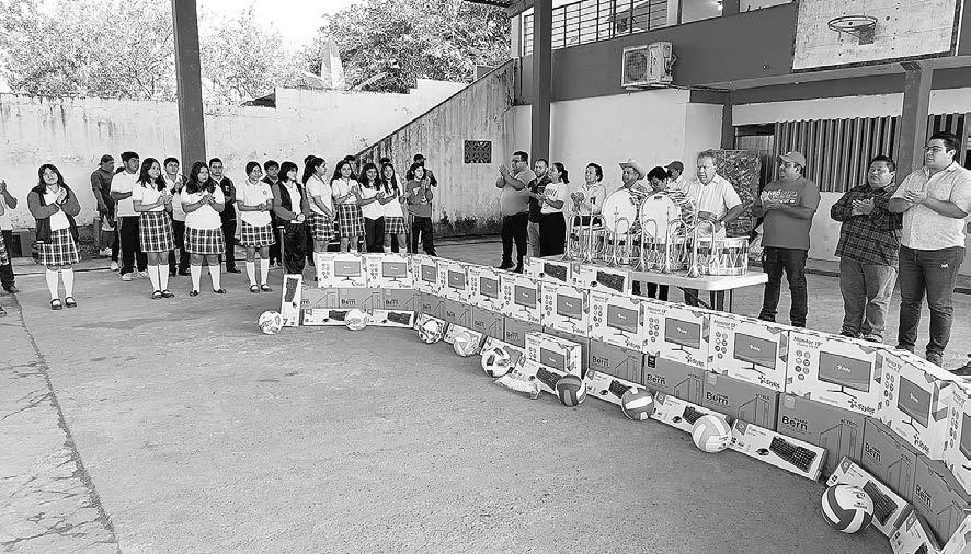 Un total de 15 computadoras, 1 banda de guerra, 5 balones de fútbol y 5 balones y una red de voleibol, fue el paquete que entregó el alcalde C.P Héctor Lagunes Reyes, al Telebachillerato de Puntilla Aldama en compañía de la presidenta del DIF, Enfermera Carmen Marín Martínez y directores de área.