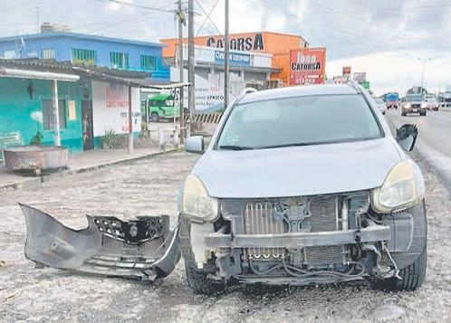 Nissan, de la línea Rogue, con placas de circulación YSR-418-B del estado, resultó dañada de la fascia delantera.
