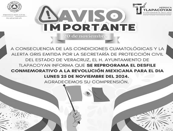 Antelascondicionesclimatológicas y la alerta gris que ha emitido la Secretaría de Protección Civil del Estado de Veracruz (SPC), el H. Ayuntamiento de Tlapacoyan, pospone el desfile conmemorativo al 114 aniversario de la Revolución Mexicana.