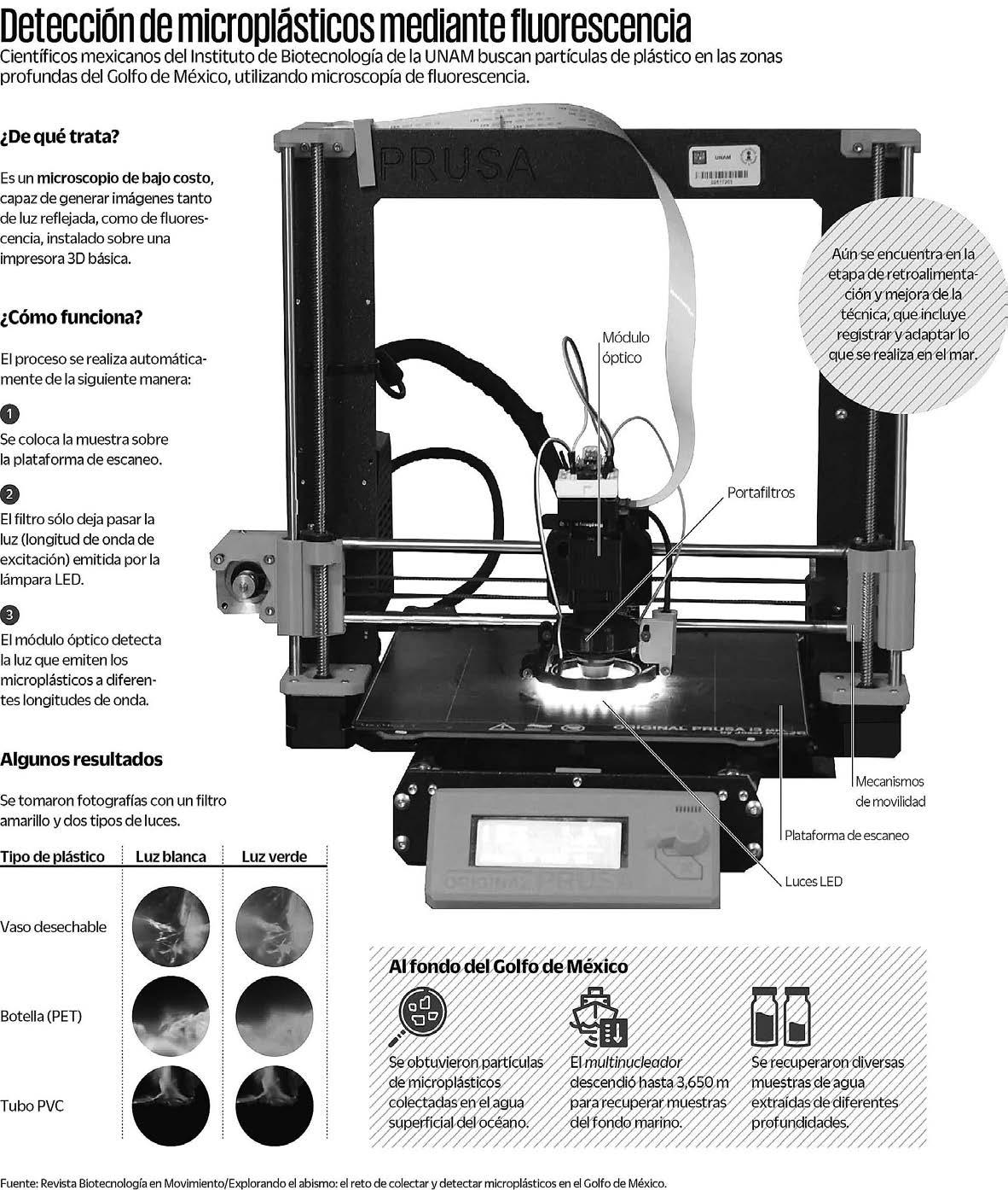 a la fragmentación de los elementos heredados. Es así que las predicciones de los modelos indican el potencial de daño ambiental a gran escala en un plazo de 70 a 100 años, pero las evaluaciones de riesgo detalladas son limitadas porque aún faltan datos. En México, un grupo de investigadores del Instituto de Biotecnología de la UNAM apostó por la exploración marina para detectar de manera más puntual el tipo de microplásticos que hay en el Golfo de México. Para lograr esto se utilizó un microscopio de bajo costo para hacer mediciones de fluorescencia de materiales detectados en diversas profundidades del fondo marino en sus lugares más remotos, como la fosa abisal Sigsbee. A bordo del buque oceanográfico Justo Sierra de la UNAM, se llevó un nuevo microscopio de bajo costo para identificar partículas en muestras de agua y sedimento del fondo marino. Un microscopio de fluorescencia tiene una fuente de luz que emite la longitud de onda de excitación y un objetivo que tiene un filtro que sólo deja pasar