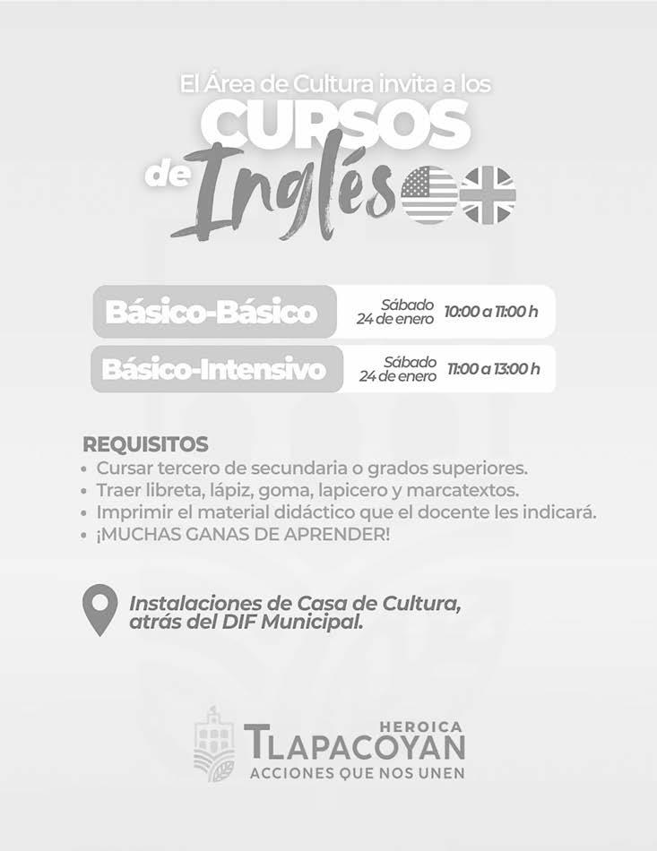 Como parte del compromiso del Presidente Municipal Miguel Ángel Cervantes Córdoba de fortalecer la educación y brindar más herramientas de desarrollo para las y los tlapacoyenses, el Área de Cultura del H. Ayuntamiento de Tlapacoyan pondrá en marcha cursos de inglés básico.