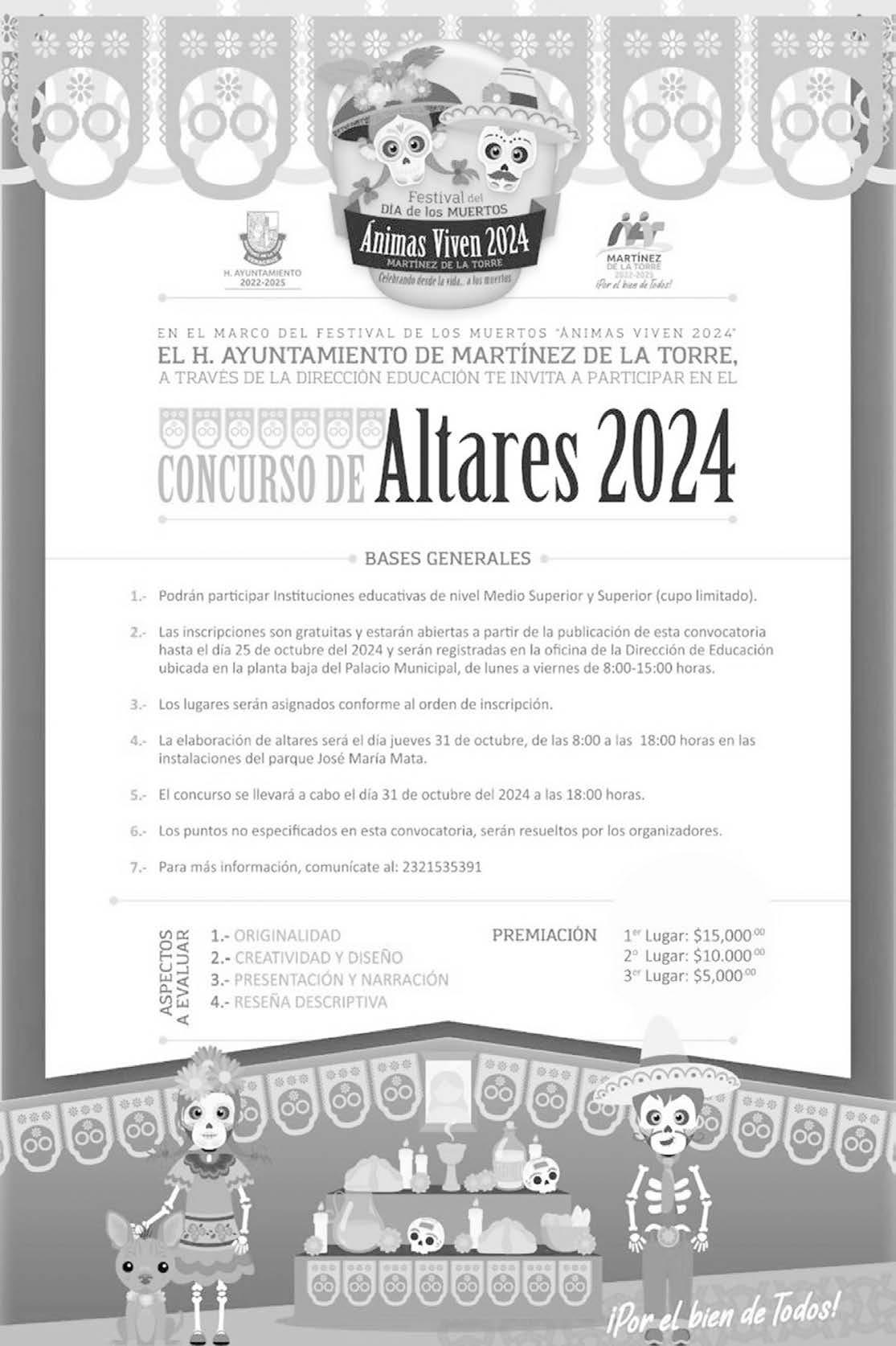 La invitación, comentó, ya fue llevada a las escuelas, para quienes deseen participar, pero la convocatoria es abierta para la sociedad civil y colonias. Las inscripciones son en la agencia municipal de Villa Independencia en horario de oficina. El año pasado, recordó, hubo una muy buena respuesta, puesto que se realizaron diez altares y participó desde el nivel preescolar hasta el Tecnológico Superior de Martínez de la Torre y las mismas familias, quienes mostraron la tradición de Día de Muertos convertida en una ofrenda de vida.