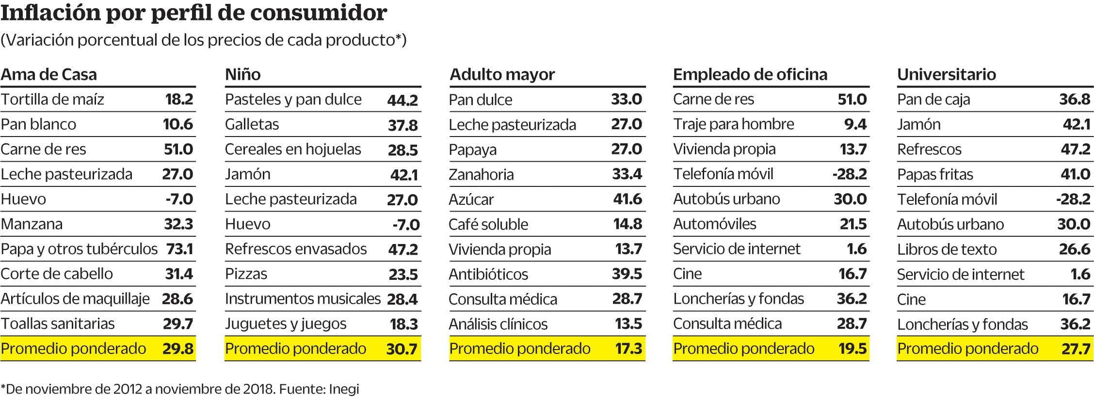 En un ejercicio realizado por EL UNIVERSAL se eligieron siete canastas que se adecúan a estas personalidades: ama de casa, empleado de oficina, deportista, estudiante de nivel medio superior, un niño, un adulto mayor y el bohemio. A cada perfil se le asignaron 10 productos y se verificó el Índice Nacional de Precios al Consumidor que da a conocer el Instituto Nacional de Estadística y Geografía (Inegi) para cada uno, en el periodo mencionado, en el cual se registró una inflación acumulada de casi 30%.