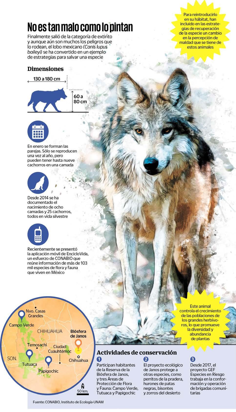 El doctor Gerardo Ceballos, a cargo del Laboratorio de Ecología y Conservación de Fauna Silvestre del Instituto de Ecología, señala que los primeros trabajos de reproducción en cautiverio se realizaron en EU, pero después hubo importantes esfuerzos por parte de México por reintroducirlos a la vida silvestre en la Reserva de la Biósfera de Janos en Chihuahua. El trabajo ha dado frutos: se logró sacar al lobo mexicano de la categoría de extinta a en riesgo de extinción. Para el investigador, esto indica que los esfuerzos de conservación binacionales, así como entre sociedad, iniciativa privada y gobierno, pueden funcionar.