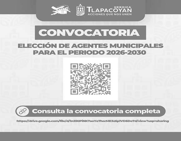 El H. Ayuntamiento de Tlapacoyan convoca a la ciudadanía de las distintas comunidades del municipio a participar en el proceso de Elección de Agentes Municipales para el periodo estatutario 2026–2030, como parte del fortalecimiento de la vida democrática y la representación comunitaria.