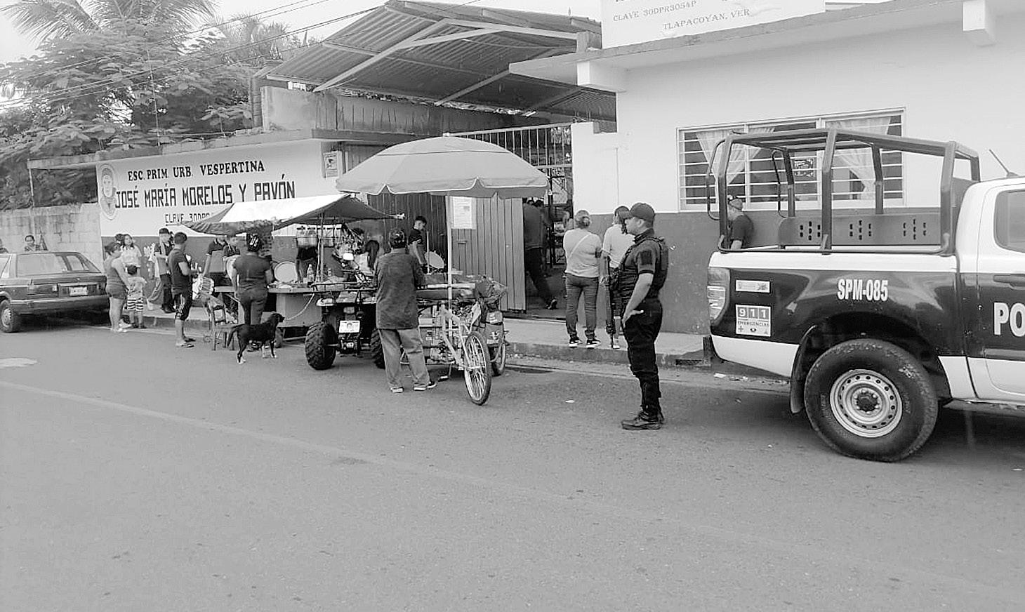 Los efectivos de la policía municipal de Tlapacoyan, brindan tareas de vigilancia en planteles educativos