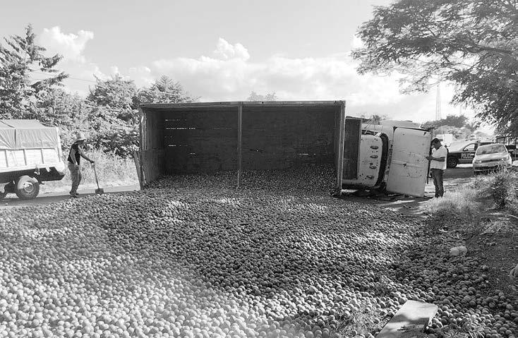 Cerca de 10 toneladas de limón persa, quedaron esparcidos sobre la carretera federal número 129, en el tramo Martínez-San Rafael, a consecuencia de una falla mecánica que registró un camión, lo que provocó que el conductor perdiera el control y terminara volcando.