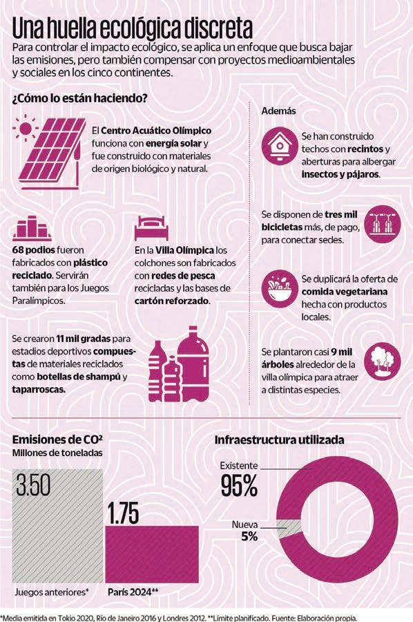 tiene un impacto, pues aunque provenga de fuentes renovables, se requiere reparación y mantenimiento que no es totalmente independiente de los combustibles fósiles. A estos elementos, se suma algo central: la generación y transporte de alimentos y residuos. Es así que, con 800 eventos deportivos olímpicos que concentran 15 mil atletas y 45 mil voluntarios, además de los miles de espectadores, los organizadores son conscientes de la enorme escala de sus ambiciones de sostenibilidad.