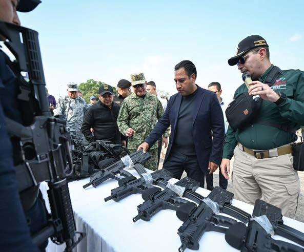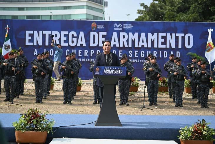 de la voluntad política y el compromiso del gobernador para pacificar Chiapas, se entregarán mil armas de nueva generación a las distintas corporaciones. Detalló que en esta jornada se distribuyeron 500 y que, próximamente, se sumarán otras 500, además de botiquines tácticos de combate. Agregó que este año también se reforzará el equipamiento con cinco unidades Kanan, 15 vehículos blindados VTL, mil chalecos antibalas, dos aeronaves no tripuladas y la incorporación de un helicóptero Bell 206 para continuar con operativos de alto impacto en todo el estado.