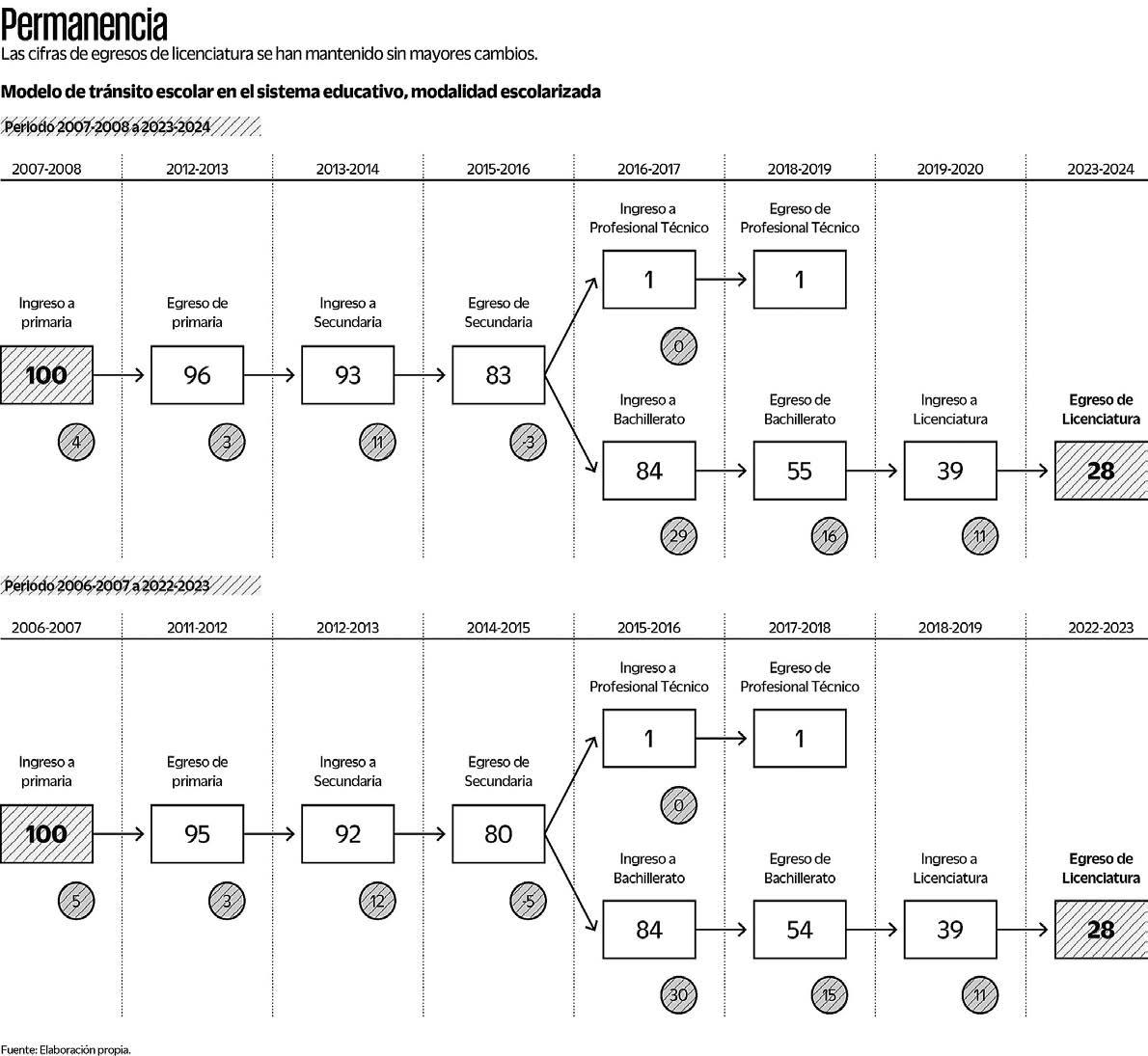 Bajo el sexenio de Andrés Manuel López Obrador no se lograron aumentar los egresos de licenciatura de manera considerable, pues de cada 100 estudiantes la tasa de egresos de educación superior se mantuvo entre 26 y 28, de acuerdo con datos de la Secretaría de Educación Pública (SEP).