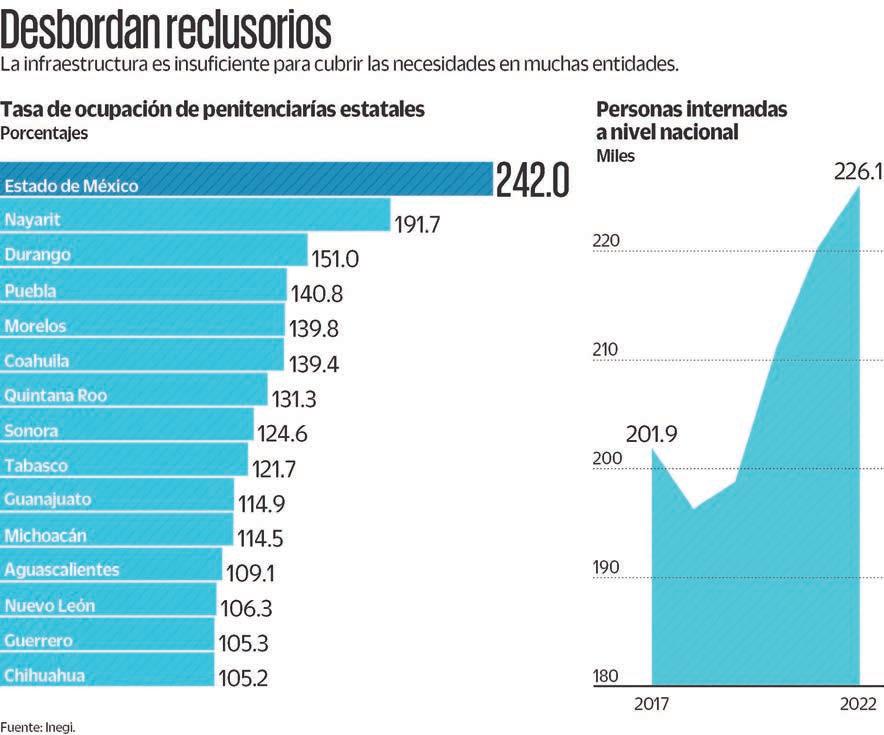 Al considerar a las personas privadas de la libertad/internadas según los espacios disponibles, los estados que reportan los niveles más altos de sobrecupo son el Estado de México, con tasa de 242.0%; Nayarit, 191.7%; Durango, 151.0%; Puebla, 140.8%; Morelos, 139.8%; Coahuila, 139.4%; Quintana Roo, 131.3%; Sonora, 124.6%, y Tabasco, con 121.7%.