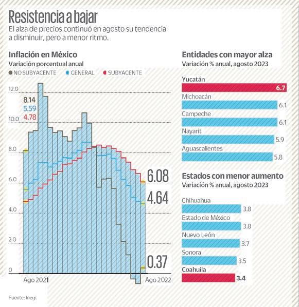 A diferencia del índice no subyacente, el segmento duro de la inflación, la parte subyacente, relacionada con el grupo de bienes y servicios cuya variación es menos volátil, tuvo un mejor comportamiento en agosto y su alza anual llegó a 6.08%, su menor tasa desde diciembre de 2021.