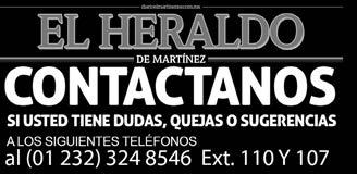 EL HERALDO DE MARTINEZ es una publicación diaria de lunes a sábado. Sábado 5 de Agosto de 2023 | Año 5 | No. 1673 | Editor responsable Ing. Eduardo Sánchez Macías. Número de certificado de Reserva de Derecho al Uso Exclusivo del Titulo 04-2017-090412182000-101. Certificado de Licitud 17081. Certificado de Licitud de Contenido 17081. Domicilio de la publicación, impreso y distribuido por Empresas Franes, S.A. de C.V., con domicilio en Boulevard Rafael Martínez de la Torre No. 168. Esq. 22 de Noviembre, Col. San Manuel, Martínez de la Torre, Ver., C.P. 93600. Tels.:(01 232) 324-85-46, 324-4676, 373-15-95, Fax 324-85-47