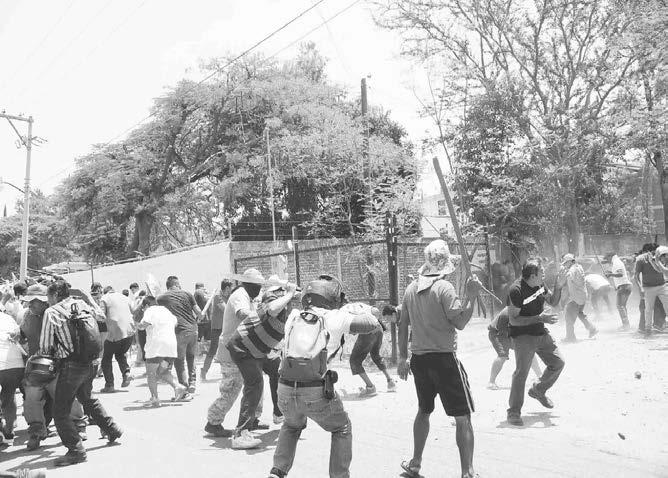 Al filo del mediodía los pobladores y transportistas de La Raya encararon a los docentes y les soltaron machetazos y cohetones, por lo que los manifestantes se dispersaron. Posteriormente, incendiaron pastizales para intentar alejar a maestros, mientras que los integrantes de la Sección 22 del SNTE tratan de sofocar el fuego.