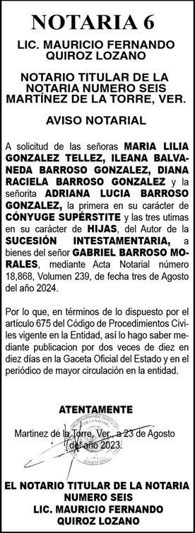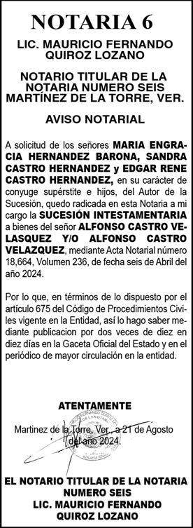 Jueves 5 de Septiembre de 2024| Año 6 | No. 2001| Editor responsable Ing. Eduardo Sánchez Macías. Número de certificado de Reserva de Derecho al Uso Exclusivo del Titulo 04-2017-090412182000-101. Certificado de Licitud 17081. Certificado de Licitud de Contenido 17081. Domicilio de la publicación, impreso y distribuido por Empresas Franes, S.A. de C.V., con domicilio en Boulevard Rafael Martínez de la Torre No. 168. Esq. 22 de Noviembre, Col. San Manuel, Martínez de la Torre, Ver., C.P. 93600. Tels.:(01 232) 324-85-46, 324-4676, 373-15-95, Fax 324-85-47
