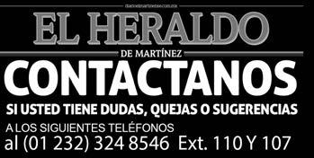 EL HERALDO DE MARTINEZ es una publicación diaria de lunes a sábado. Jueves 6 de Julio de 2023 | Año 5 | No. 1646 | Editor responsable Ing. Eduardo Sánchez Macías. Número de certificado de Reserva de Derecho al Uso Exclusivo del Titulo 04-2017-090412182000-101. Certificado de Licitud 17081. Certificado de Licitud de Contenido 17081. Domicilio de la publicación, impreso y distribuido por Empresas Franes, S.A. de C.V., con domicilio en Boulevard Rafael Martínez de la Torre No. 168. Esq. 22 de Noviembre, Col. San Manuel, Martínez de la Torre, Ver., C.P. 93600. Tels.:(01 232) 324-85-46, 324-4676, 373-15-95, Fax 324-85-47