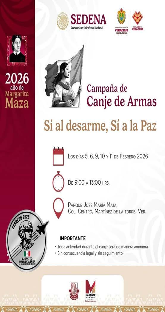 El Gobierno Municipal informa a la ciudadanía que continúa desarrollándose la Campaña de Canje de Armas “Sí al desarme, Sí a la Paz”, realizada en coordinación con la Secretaría de la Defensa Nacional (SEDENA) y el Gobierno del Estado de Veracruz, con el objetivo de fortalecer la seguridad y promover la cultura de la paz en el municipio.