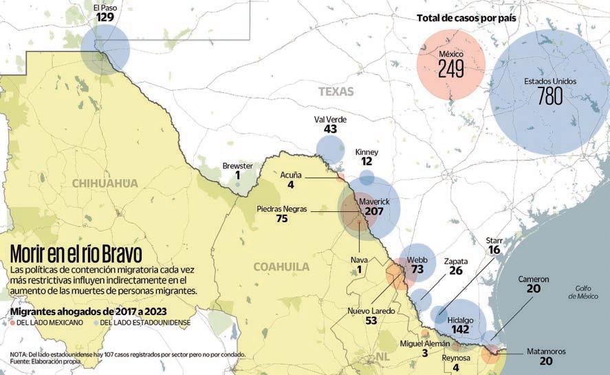 Más presión, más muertes El río Bravo es un afluente de 3 mil kilómetros que divide a México de Estados Unidos. Sus aguas recorren el borde sur del enorme estado de Texas y hacen frontera con los mexicanos Chihuahua, Coahuila, Nuevo León y Tamaulipas.