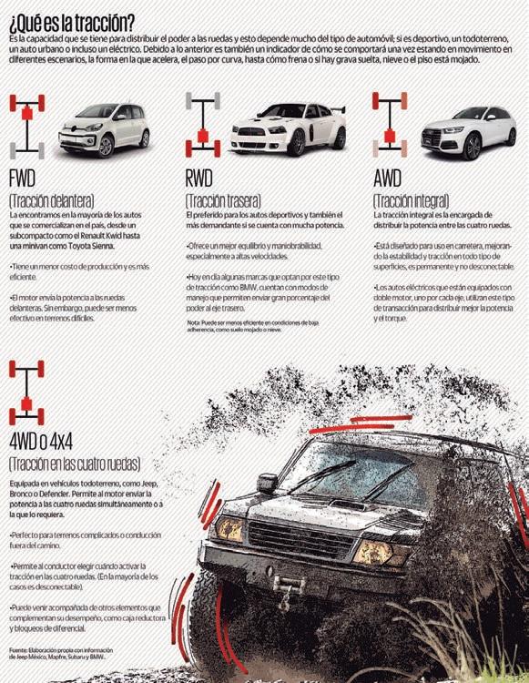 Así como hay diferentes tipos dze motores y transmisiones, cada auto está equipado con un tipo de tracción. La tracción es básicamente la capacidad que se tiene para distribuir el poder a las ruedas y esto depende mucho del tipo de automóvil; si es deportivo, un todoterreno, un auto urbano o incluso un eléctrico.