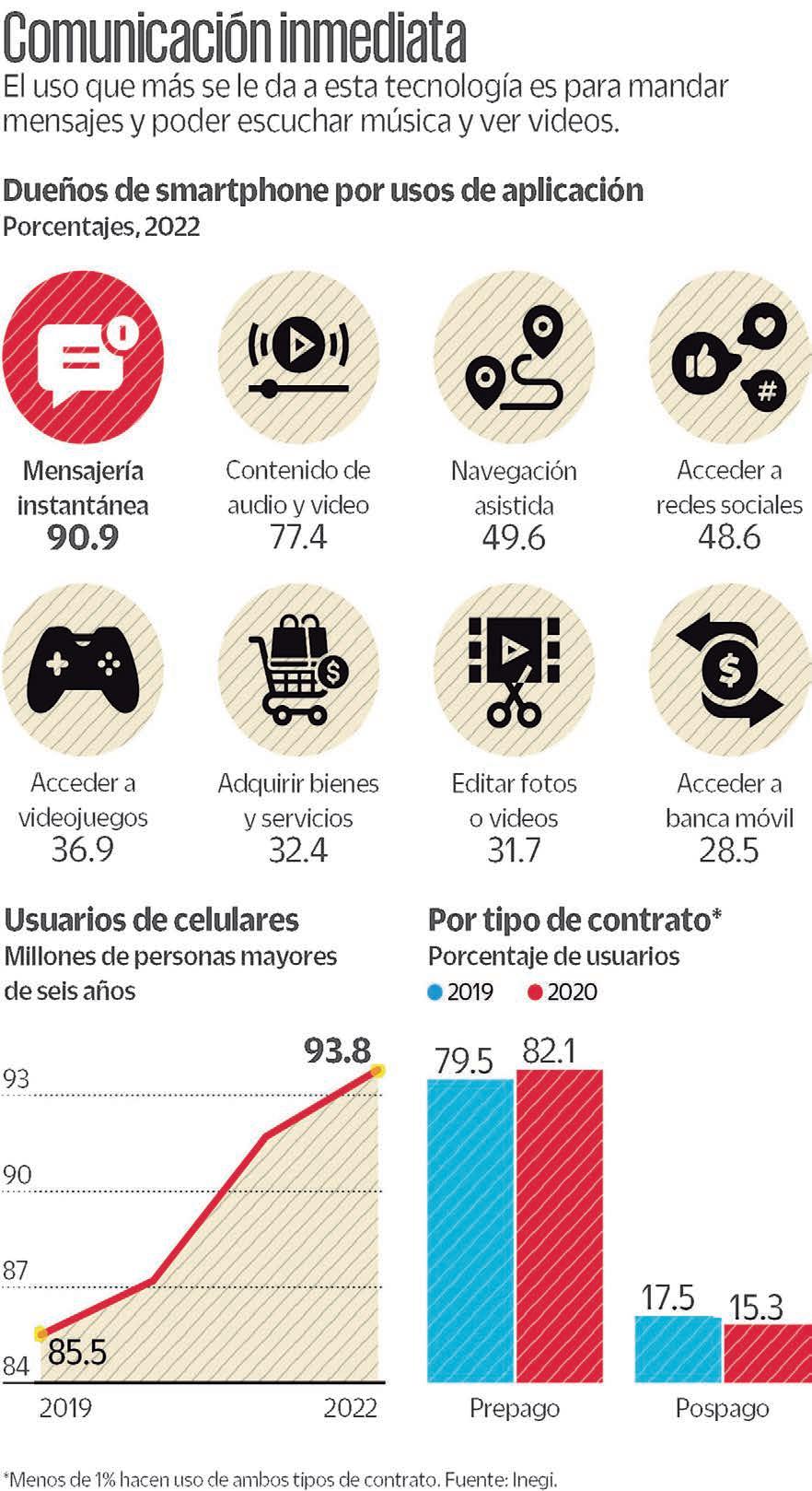 La encuesta estima que, el año pasado, 90.9% de la población usuaria de teléfono inteligente utilizó aplicaciones de mensajería instantánea; 78.6% ingresó a redes sociales y 77.4% accedió a contenidos de audio y video. Solo 28.5% lo empleó para acceder a la banca móvil.