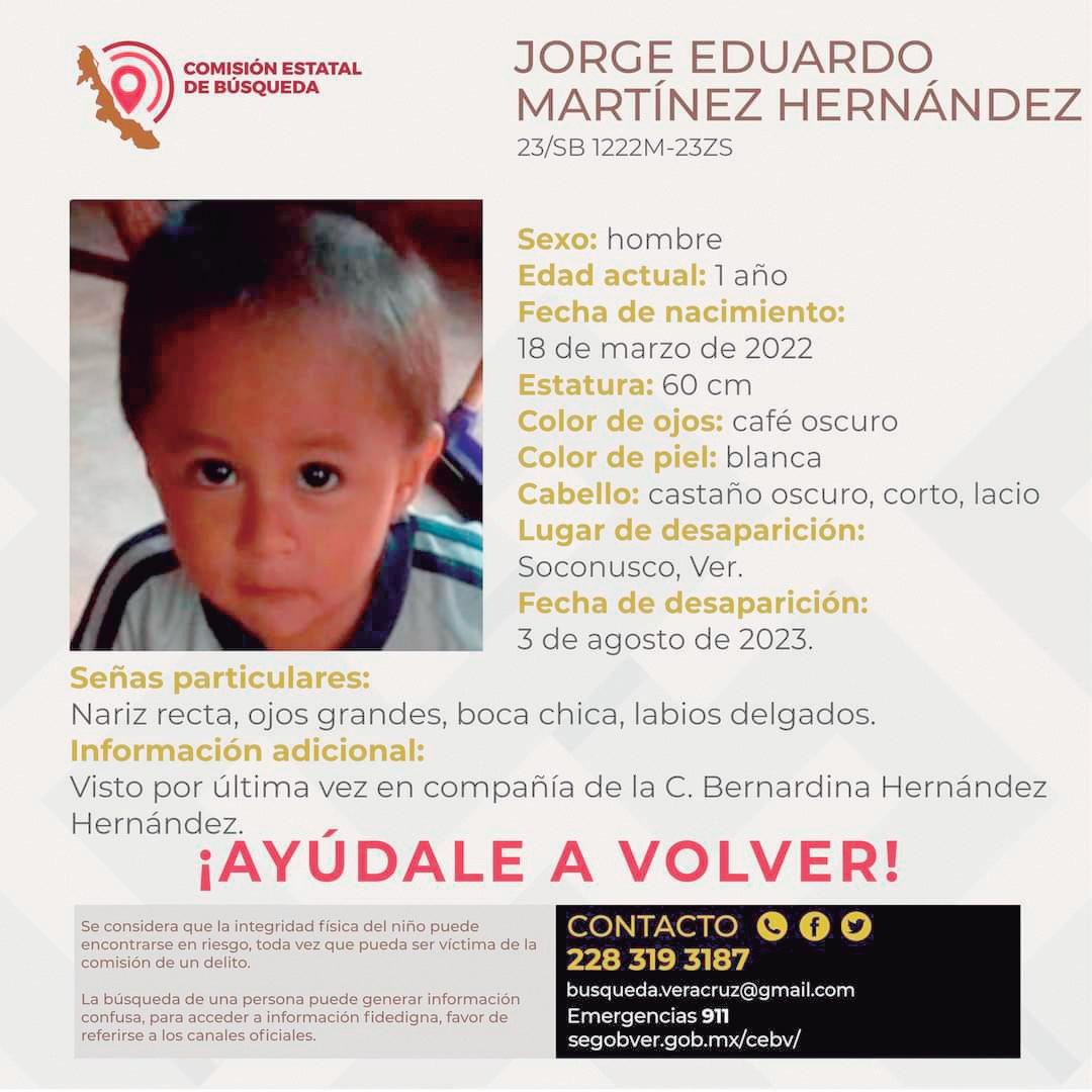 La ficha 23/SB 1222M-23ZS reporta la desaparición de Jorge Eduardo Martínez Hernández, de un año de edad, con quien se perdió contacto el pasado 3 de agosto de 2023, en Soconusco, Veracruz.