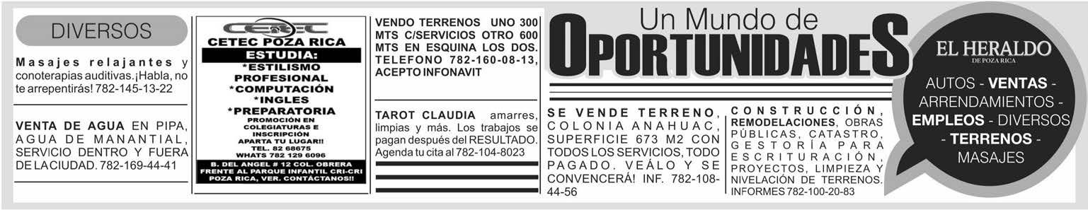 Heraldo de Veracruz, con domicilio en Privada 16 Norte No. 130 Col. Obrera, Poza Rica de Hidalgo, Ver. C.P. 93260 Tel. (782) 826 86 36 y (782) 824 6193 dpozarica2007@gmail.com publicidadhpr@gmail.com CONTACTO REDACCIÓN CONTACTO PUBLICIDAD | elheraldodepozarica.com.mx | PRIMERA SECCIÓN