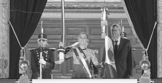 su esposo, Jesús María Tarriba. Ante aproximadamente 280 mil mexicanas y mexicanos que se dieron cita en el magno Zócalo de la Ciudad de México, la Jefa del Ejecutivo Federal ondeó en el balcón principal de Palacio Nacional la bandera nacional, que recibió por primera vez en la historia de mujeres militares pertenecientes al Heroico Colegio Militar: de la abanderada teniente de Policía Militar, Jennifer Samantha Torres Jiménez y de la escolta conformada por las cabo de cadetes Samira Michel Delgadillo Chávez; Itzel Sarahi Martínez Tozcano; Karla Paola Guevara Pérez; y las cadetes Andrea Carvajal Audelo y Yetzelany Gallegos Ortiz. Asimismo, la mandataria, retomó una tradición inaugurada por