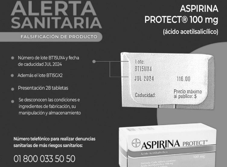 La Comisión Federal para la Protección contra Riesgos Sanitarios (Cofepris) alerta a la población sobre la falsificación de Aspirina Protect de 100 mg; de 28 tabletas con número de lote BT15UX4.