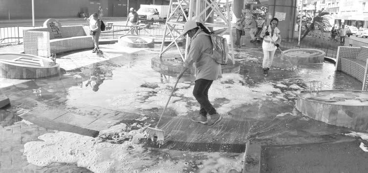 Los trabajadores se presentaron acompañados de pipas y jabón con los que se generó agua jabonosa, para realizar la limpieza del área que coti-