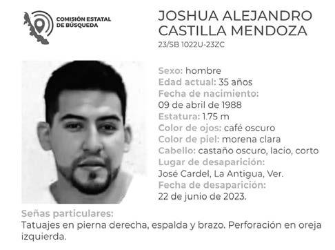 Joshua es originario de Xalapa, cuenta con edad de 35 años, estuvo en Ciudad Cardel, municipio de La Antigua el jueves 22 de junio, y ahí fue visto por última vez.