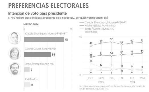 Luego de transcurrir el primer mes de campañas electorales, Claudia Sheinbaum, candidata de Morena-PVEM-PT, mantiene una ventaja de 17 puntos en las preferencias sobre Xóchitl Gálvez, al obtener la morenista 51% de la intención de voto, frente a 34% de la candidata de la alianza de oposición PAN-PRI-PRD, revela la más reciente encuesta nacional de El Financiero, realizada en marzo vía telefónica a mil 200 electores.