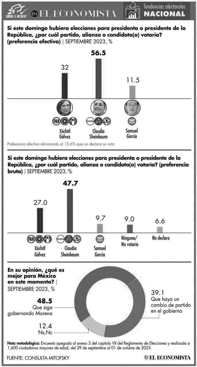 Del total de los ciudadanos consultados, 56.5% contestó que darán su sufragio a Claudia Sheinbaum, virtual candidata de Morena, PT y PVEM, mientras que Xóchitl Gálvez Ruiz (PAN, PRI y PRD) obtuvo 32%, y 11.5% de los participantes contestó que su opción es Samuel García, de Movimiento Ciudadano.