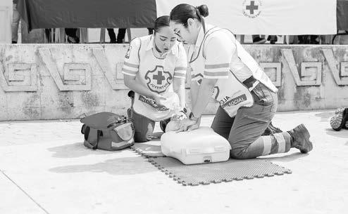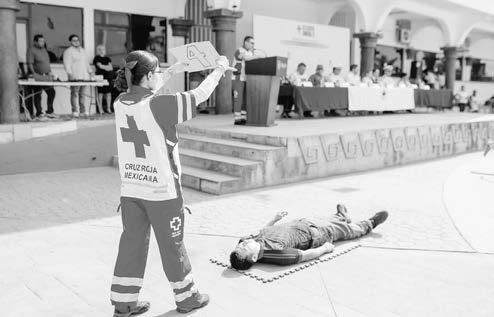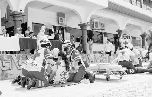 Durante la ceremonia, el cuerpo de paramédicos y socorristas de la institución realizó un simulacro de atención prehospitalaria, narrado por el Coordinador Local de Socorros, TUM Jorge Machuca Pérez, quien mostró parte del importante trabajo que realiza el personal de Cruz Roja en situaciones de emergencia.