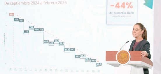 Ciudad de México.- La Presidenta de México, Claudia Sheinbaum Pardo, destacó que, gracias a la Estrategia Nacional de Seguridad, los homicidios dolosos en el país disminuyeron 44 por ciento, de septiembre de 2024 a febrero de 2026, al pasar de un promedio diario de 86.9 a 48.8, lo que representa una reducción de la violencia de 38 homicidios diarios menos; siendo febrero de este año el más bajo desde 2015.