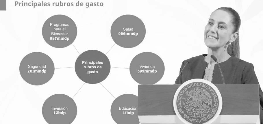 y humanista que tiene como objetivo la máxima de que “por el bien de todos, primero los pobres”, ante esto, detalló que los principales rubros son: Programas para el Bienestar con una inversión social de 987 mil millones de pesos (mdp) que representan un poco más de 2.5 por ciento del Producto Interno Bruto (PIB) y que significa una profundización de la estrategia que logró sacar de la pobreza a 13.4 millones de mexicanos. Detalló que en Salud se propone un presupuesto de 966 mil mdp; Vivienda con 399 mil mdp; Educación 1.1 billones de pesos (bdp); Inversión Pública con 1.3 bdp y Seguridad con 201 mil mdp. Explicó que estos montos significan, en Programas para el Bienestar un incremento de 7.5 por ciento en términos reales, en Salud de 9.6 por ciento, en Vivienda de 7 por ciento, mientras que, en el caso de la inversión y los proyectos del Plan México se destinan recursos equivalentes al 2.5 por ciento del PIB en proyectos como: expansión ferroviaria con 143 mil mdp; en Pemex con 247 mil mdp; en Comisión Federal de Electricidad (CFE) con 61 mil mdp y en obras hidráulicas con 20 mil millones de pesos.