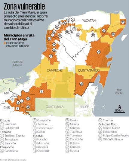 La ruta del Tren Maya incluye, al menos, 28 municipios vulnerables a los efectos de la crisis climática, según un cotejo de su trazo y el Atlas de Vulnerabilidad 2021 del Instituto Nacional de Ecología y Cambio Climático (INECC). De ellos, 14 se localizan en Yucatán, cinco en Campeche, tres en Tabasco, cuatro en Quintana Roo y dos en Chiapas. El ferrocarril atravesará 41 municipios y 181 localidades.