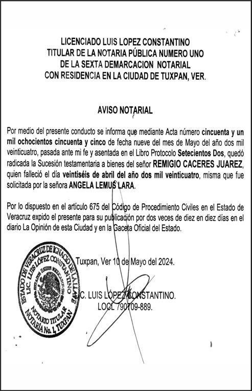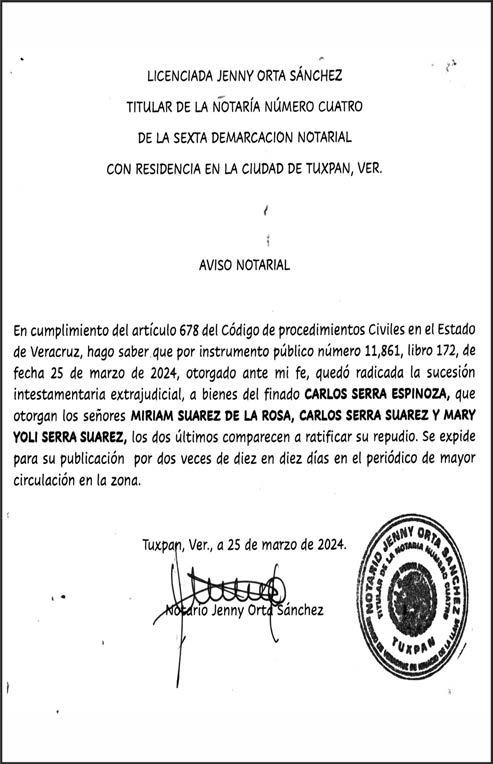 Martes 14 de Mayo de 2024 Primera Sección 2. ESTADO El Heraldo de Tuxpan es una publicación de lunes a sábado. Editor responsable Ing. Eduardo Sánchez Macías. Número de Certificado de Reserva de Derecho al Uso Exclusivo del título 04-2016062417532400-101. Certificado de Licitud de Título: 16764. Certificado de licitud de contenido 16764. Domicilio de la publicación, impreso y distribuido por Editora Sánchez S.A. de C.V., con domicilio en 15 de Septiembre No. 7 Col. La Rivera, Tuxpan, Veracruz. C.P. 92800 TEL. 01 (783) 834 16 73 y 01 (783) 835 58 34. ediciontuxpan@hotmail.com CONTACTO REDACCIÓN diariotuxpublicidad@hotmail.com CONTACTO PUBLICIDAD G R U P O E D I T O R I A L DE VERACRUZ | elheraldodetuxpan.com.mx | Gerente Administrativo Lic. Flor Parrilla Silva Director General Lic.