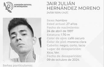 La ficha 24/SB 1559U-24ZC reporta la desaparición de Jair Julián Hernández Moreno, de 27 años de edad, con quien se perdió el contacto el pasado 9 de octubre de 2024 en Xico, Veracruz.