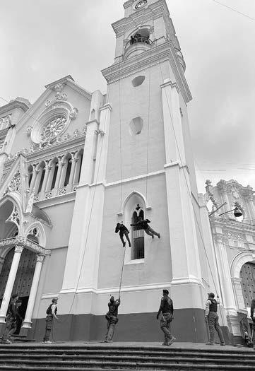 Ellos se lanzaban en parejas desde la cima del campanario de la iglesia, mientras los helicópteros de la Fuerza Civil volaban sobre el primer cuadro de la capital veracruzana.