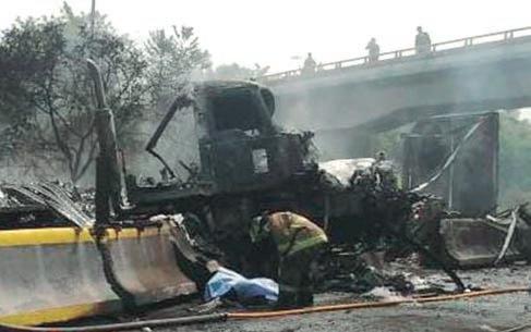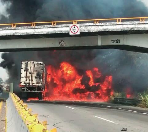Tráiler queda reducido a cenizas tras impactarse contra muro; conductor muere, en Cosoleacaque.
