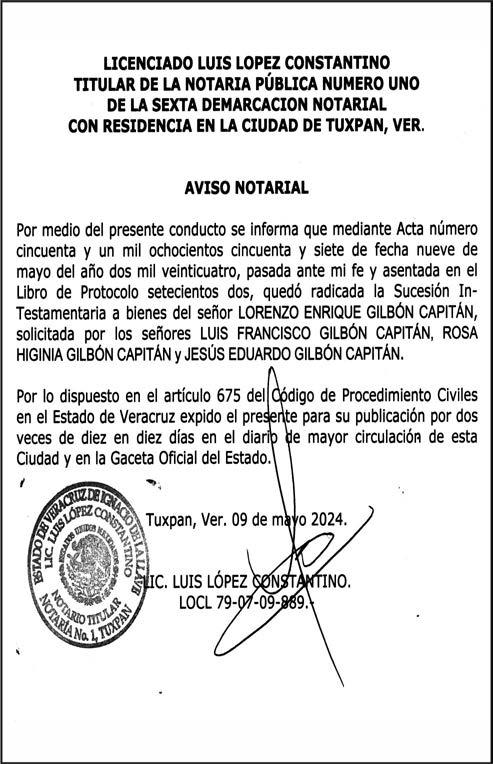 Miércoles 22 de Mayo de 2024 Primera Sección 2. ESTADO El Heraldo de Tuxpan es una publicación de lunes a sábado. Editor responsable Ing. Eduardo Sánchez Macías. Número de Certificado de Reserva de Derecho al Uso Exclusivo del título 04-2016062417532400-101. Certificado de Licitud de Título: 16764. Certificado de licitud de contenido 16764. Domicilio de la publicación, impreso y distribuido por Editora Sánchez S.A. de C.V., con domicilio en 15 de Septiembre No. 7 Col. La Rivera, Tuxpan, Veracruz. C.P. 92800 TEL. 01 (783) 834 16 73 y 01 (783) 835 58 34. ediciontuxpan@hotmail.com CONTACTO REDACCIÓN diariotuxpublicidad@hotmail.com CONTACTO PUBLICIDAD G R U P O E D I T O R I A L DE VERACRUZ | elheraldodetuxpan.com.mx | Gerente Administrativo Lic. Flor Parrilla Silva Director General Lic.