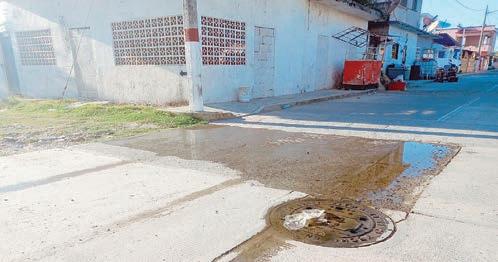 Aguas negras fluyen de una coladera de drenaje colapsada.