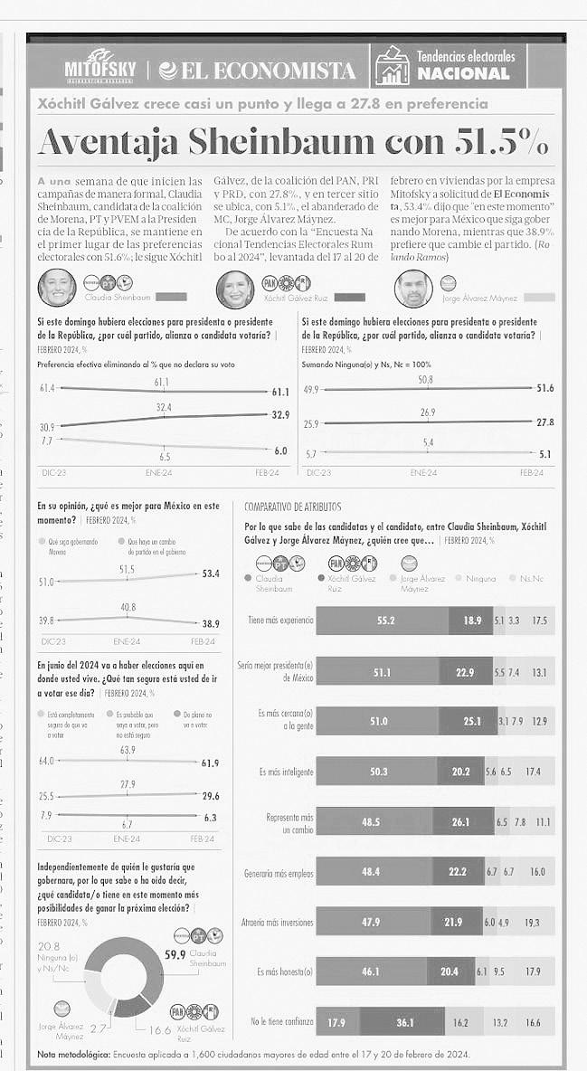 A una semana de que inicien las campañas de manera formal, Claudia Sheinbaum, candidata de la coalición de Morena, PT y PVEM a la Presidencia de la República, se mantiene en el primer lugar de las preferencias electorales con 51.6%; le sigue Xóchitl Gálvez, de la coalición del PAN, PRI y PRD, con 27.8%, y en tercer sitio se ubica, con 5.1%, el abanderado de MC, Jorge Álvarez Máynez. De acuerdo con la “Encuesta Nacional Tendencias Electorales Rumbo al 2024”, levantada del 17 al 20 de febrero en viviendas por la empresa Mitofsky a solicitud de El Economista, 53.4% dijo que “en este momento” es mejor para México que siga gobernando Morena, mientras que 38.9% prefiere que cambie el partido.