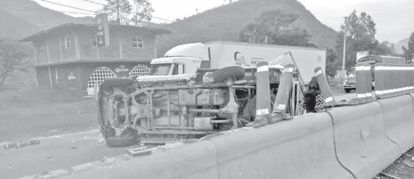 de velocidad y a una presunta falla mecánica en el sistema de dirección, chocó frontalmente contra el muro de contención central, se brincó de los cuerpos de descenso a los de ascenso y terminó volcada sobre el carril contrario.