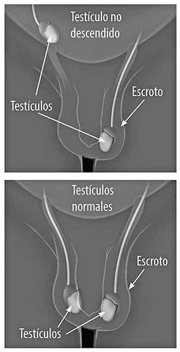 El riesgo es mayor en hombres que hayan tenido testículos no descendidos localizados en la zona del estómago que en los que los hayan tenido en la ingle. El riesgo también es mayor cuando están afectados los dos testículos. Una cirugía para corregir el testículo no descendido podría reducir el riesgo de cáncer testicular. Sin embargo, el riesgo de cáncer no desaparece por completo. Problemas de fertilidad. Estos problemas dificultan el embarazo de la pareja. Son más comunes en hombres que han tenido un testículo no descendido. Los problemas de fertilidad pueden agravarse si un testículo no descendido tarda mucho tiempo en recibir tratamiento. Otros problemas de salud relacionados con los testículos no descendidos son: Torsión testicular. Se trata de la torsión del cordón que lleva sangre al escroto. Es un problema doloroso que impide la llegada de sangre al testículo. Sin un tratamiento rápido, el testículo puede quedar tan dañado que resulte necesario extirparlo quirúrgicamente. Traumatismo. Si un testículo está en la ingle, puede resultar dañado por la presión contra el hueso púbico. Hernia inguinal. Una parte de los intestinos puede empujar hacia la ingle a través de un punto débil en los músculos de la zona del estómago. El bulto que esto provoca puede ser doloroso.