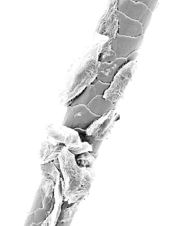 mas blancas visibles en el cabello, En el caso de la caspa seca, estas escamas son pequeñas y finas, como la nieve. En la caspa grasa, las escamas son más grandes y se suelen adherir a la raíz del cabello.