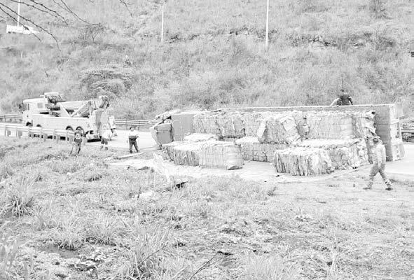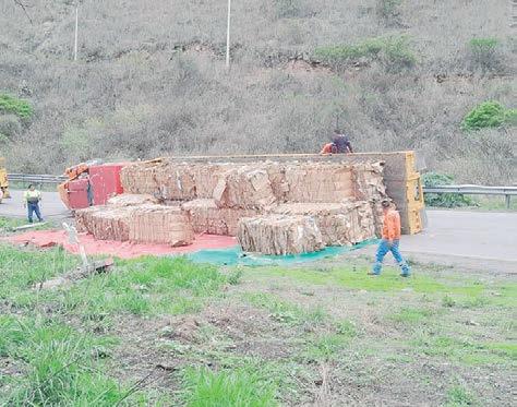 Unidad que trasportaba varias toneladas de pacas de cartón, sufre falla mecánica y se accidenta